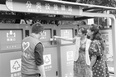 在金華市金東區(qū)的每個(gè)垃圾投放點(diǎn)附近,都有一名垃圾巡檢員會(huì)協(xié)助居民做好分類(lèi),定時(shí)、定點(diǎn)投放垃圾。