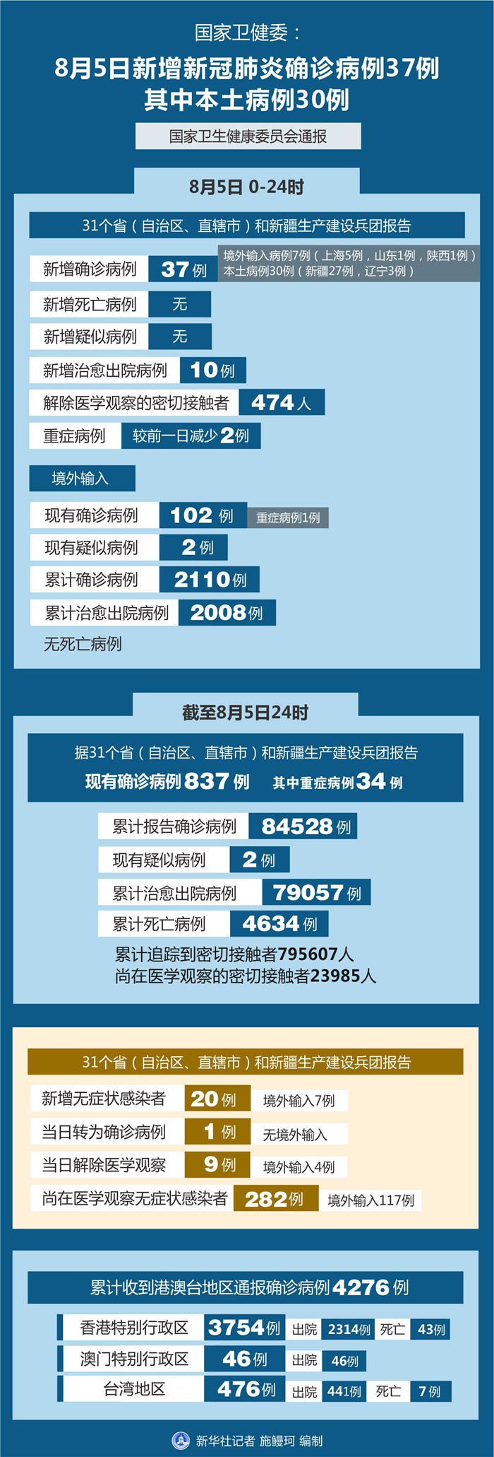 截至8月5日24時,據(jù)31個?。ㄗ灾螀^(qū)、直轄市)和新疆生產(chǎn)建設(shè)兵團報告,現(xiàn)有確診病例837例(其中重癥病例34例),累計治愈出院病例79057例,累計死亡病例4634例,累計報告確診病例84528例,現(xiàn)有疑似病例2例。累計追蹤到密切接觸者795607人,尚在醫(yī)學(xué)觀察的密切接觸者23985人。