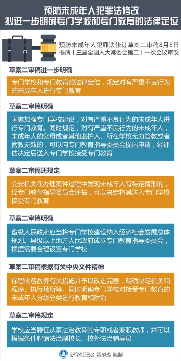 新華社北京8月8日電(記者熊豐)預(yù)防未成年人犯罪法修訂草案二審稿8日提請十三屆全國人大常委會第二十一次會議審議。草案二審稿進一步明確專門學(xué)校和專門教育的法律定位,規(guī)定對有嚴(yán)重不良行為的未成年人進行專門教育。