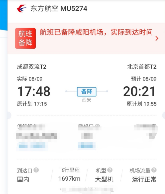 9日傍晚備降西安的東航MU5274次航班上的乘客已更換飛機(jī),于9日21:43,從西安咸陽國(guó)際機(jī)場(chǎng)起飛前往目的地北京。