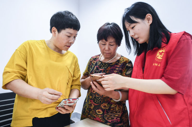 6月4日,在杭州市臨安區(qū)錦城街道勝利社區(qū),青年社工指導(dǎo)老人們用手機購物 徐昱/攝