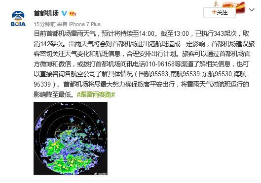 據(jù)北京首都國(guó)際機(jī)場(chǎng)官方微博消息,目前首都機(jī)場(chǎng)雷雨天氣,預(yù)計(jì)將持續(xù)至14時(shí)。截至13時(shí),已執(zhí)行343架次,取消142架次。雷雨天氣將會(huì)對(duì)首都機(jī)場(chǎng)進(jìn)出港航班造成一定影響,首都機(jī)場(chǎng)建議旅客密切關(guān)注天氣變化和航班信息,合理安排出行計(jì)劃。