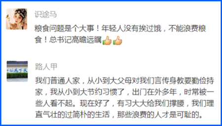 吃飯人人會,但怎么吃卻見境界。早在2013年,總書記在闡述糧食安全戰(zhàn)略時就告誡人們,“要牢記歷史,在吃飯問題上不能得健忘癥,不能好了傷疤忘了疼”。這次,總書記又強調(diào),“盡管我國糧食生產(chǎn)連年豐收,對糧食安全還是始終要有危機意識”。對此,很多網(wǎng)友深表贊同,認為這些指示要言不煩、直指要害,我們決不能忘記餓肚子的歲月!