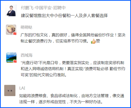 總書記強調(diào),要加強立法,強化監(jiān)管,采取有效措施,建立長效機制,堅決制止餐飲浪費行為。網(wǎng)友們就此積極獻計獻策。
