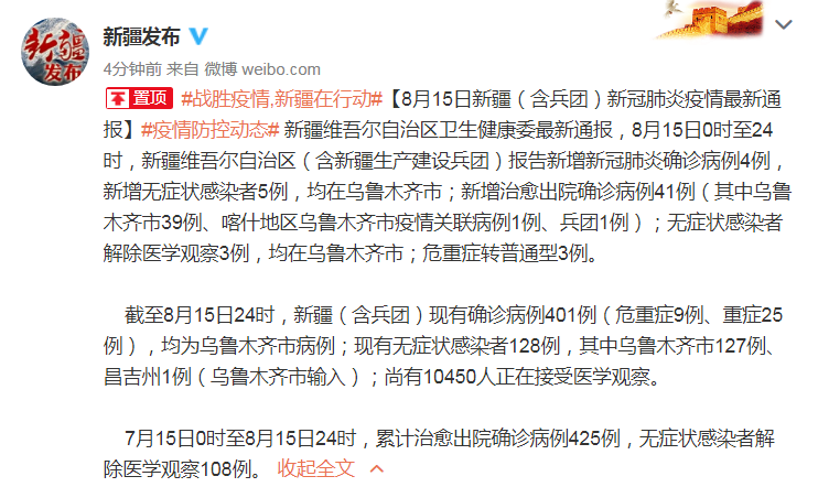 截至8月15日24時(shí),新疆(含兵團(tuán))現(xiàn)有確診病例401例(危重癥9例、重癥25例),均為烏魯木齊市病例;現(xiàn)有無(wú)癥狀感染者128例,其中烏魯木齊市127例、昌吉州1例(烏魯木齊市輸入);尚有10450人正在接受醫(yī)學(xué)觀察。