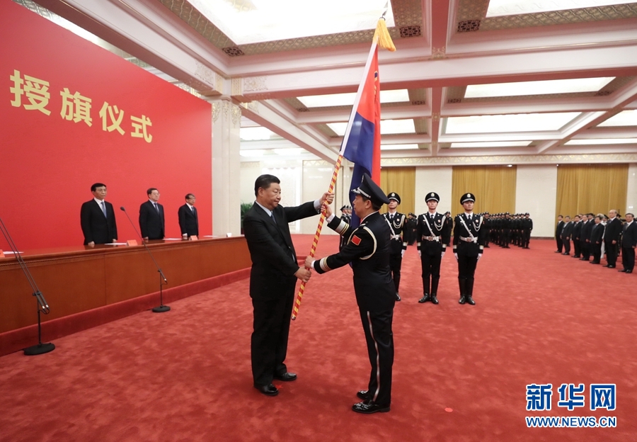 8月26日,中國人民警察警旗授旗儀式在人民大會堂舉行。中共中央總書記、國家主席、中央軍委主席習(xí)近平向中國人民警察隊(duì)伍授旗并致訓(xùn)詞。這是習(xí)近平向中國人民警察隊(duì)伍授旗。 新華社記者 鞠鵬 攝