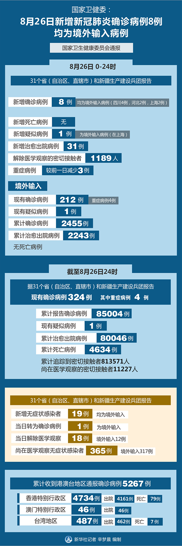 截至8月26日24時(shí),據(jù)31個(gè)?。ㄗ灾螀^(qū)、直轄市)和新疆生產(chǎn)建設(shè)兵團(tuán)報(bào)告,現(xiàn)有確診病例324例(其中重癥病例4例),累計(jì)治愈出院病例80046例,累計(jì)死亡病例4634例,累計(jì)報(bào)告確診病例85004例,現(xiàn)有疑似病例1例。累計(jì)追蹤到密切接觸者813571人,尚在醫(yī)學(xué)觀察的密切接觸者11227人。