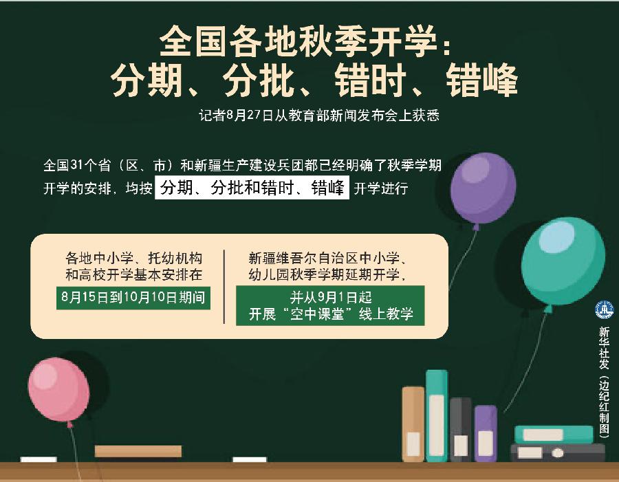 教育部應(yīng)對(duì)新冠肺炎疫情工作領(lǐng)導(dǎo)小組辦公室主任、體育衛(wèi)生與藝術(shù)教育司司長(zhǎng)王登峰介紹說(shuō),各地中小學(xué)、托幼機(jī)構(gòu)和高校開(kāi)學(xué)基本安排在8月15日到10月10日期間。新疆維吾爾自治區(qū)中小學(xué)、幼兒園秋季學(xué)期延期開(kāi)學(xué),并從9月1日起開(kāi)展“空中課堂”線上教學(xué)。