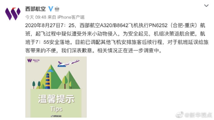 8月27日,西部航空官方微博通報稱,7時25分,合肥飛往重慶的PN6252航班在起飛途中疑似遭受外來小動物侵入,為安全起見,機組決定返航,航班于7時55分安全降落。記者從西部航空獲悉,隨后,航空公司安排另一架客機于10時01分運送該航班乘客,并于11時50分安全落地重慶。西部航空稱,除原航班延誤外,返航事件未對乘客、航司及合肥新橋國際機場造成其他影響。導(dǎo)致客機返航的具體原因仍在調(diào)查中。(記者林翔、汪奧娜)