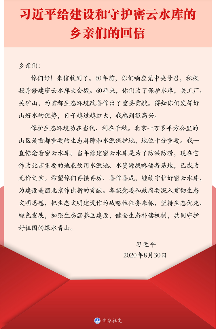 新華社北京8月31日電 習(xí)近平給建設(shè)和守護(hù)密云水庫的鄉(xiāng)親們的回信