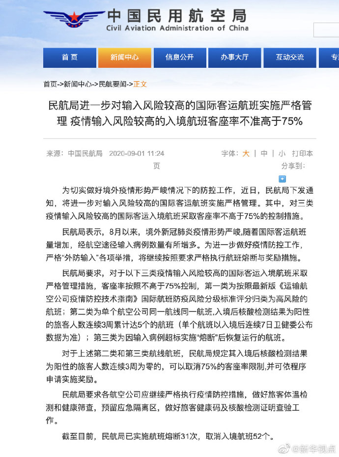 截至目前,民航局已實(shí)施航班熔斷31次,取消入境航班52個(gè)。