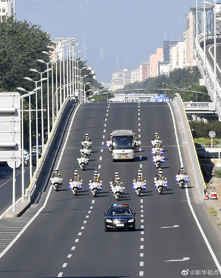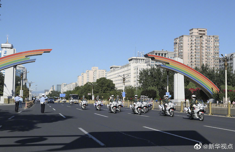 國(guó)家勛章和國(guó)家榮譽(yù)稱號(hào)獲得者集體乘坐禮賓車從住地出發(fā),由國(guó)賓護(hù)衛(wèi)隊(duì)護(hù)衛(wèi)前往人民大會(huì)堂。(攝影 丁林 高潔 劉彬)