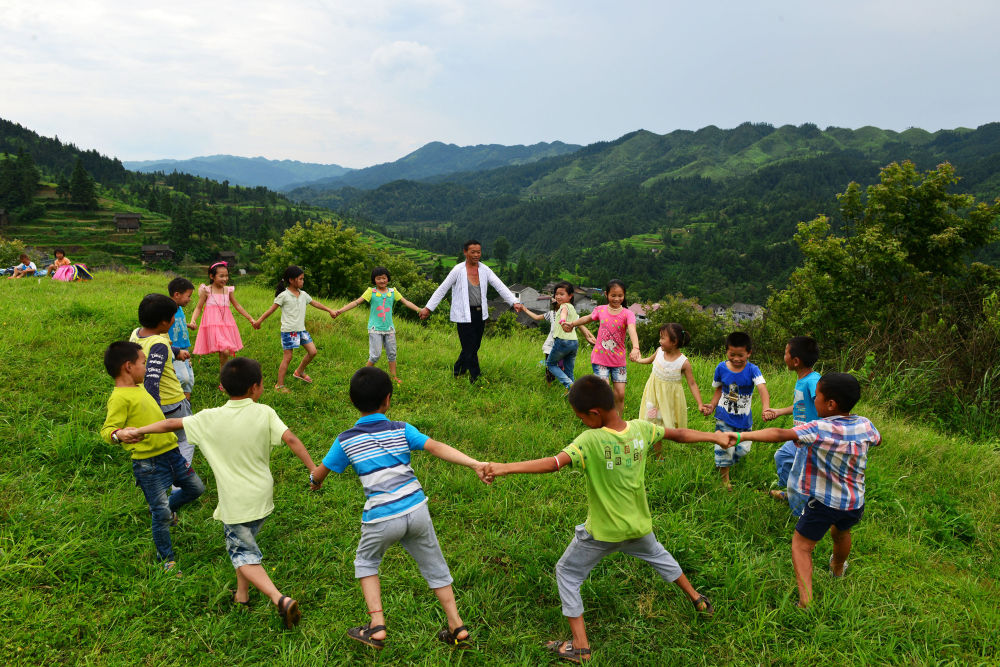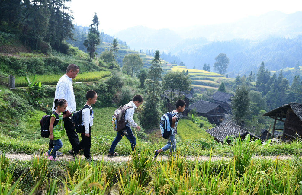 ↑廣西融水苗族自治縣的孩子手捧書本在校園合影