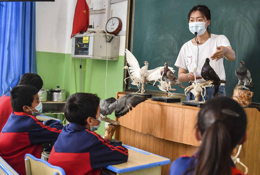 ↑新疆塔克拉瑪干沙漠腹地的小學(xué)生上科普課