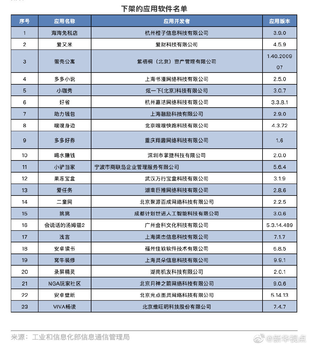 工信部14日消息,工信部此前向社會通報了101家存在侵害用戶權益行為APP企業(yè)的名單。截至目前,經第三方檢測機構核查復檢,尚有海淘免稅店、愛又米等23款APP未按要求完成整改。根據相關規(guī)定,工信部組織對這些APP進行下架。(記者 張辛欣) ????