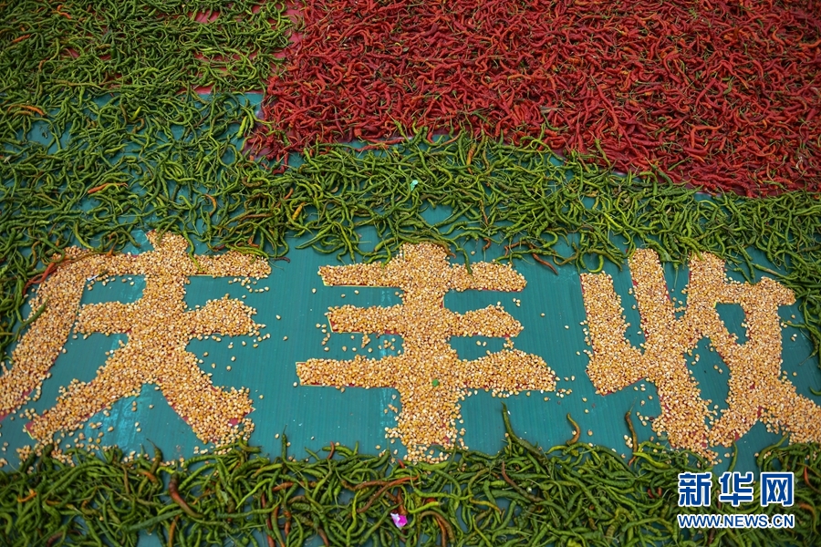 2020年慶祝中國農(nóng)民豐收節(jié)暨循化縣消費扶貧“辣椒節(jié)”上由線辣椒和玉米拼成的慶豐收圖案。(新華網(wǎng)潘彬彬攝)
