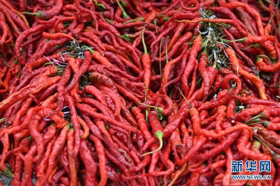 2020年慶祝中國(guó)農(nóng)民豐收節(jié)暨循化縣消費(fèi)扶貧“辣椒節(jié)”現(xiàn)場(chǎng)展示銷(xiāo)售的線辣椒。(新華網(wǎng)潘彬彬攝)