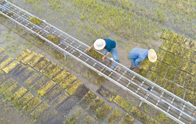 江蘇金湖縣金源農(nóng)機(jī)合作社,社員用流水線運(yùn)送水稻秧苗。賀敬華攝(人民視覺)