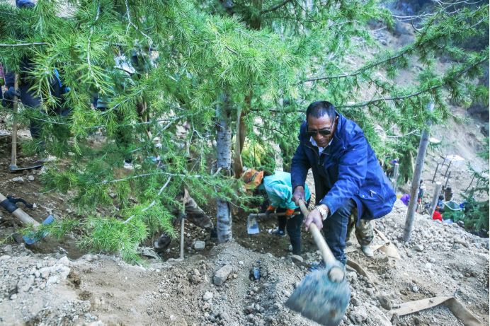 新冠肺炎疫情期間,巴拉格宗景區(qū)關閉,斯那定珠投入2000多萬購置了4萬多棵樹苗,帶領200多個員工在景區(qū)植樹。 索朗農(nóng)布/攝