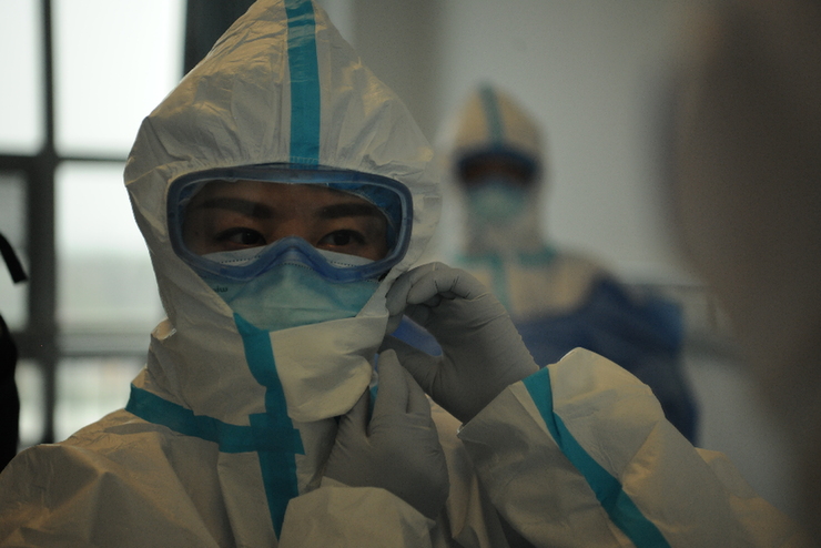 在華中科技大學同濟醫(yī)院光谷院區(qū)采訪,進重癥ICU前做好防護準備