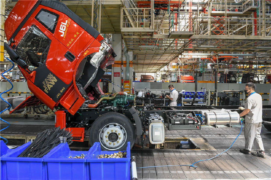 在位于長(zhǎng)春的一汽解放總裝車(chē)間,工人在裝配車(chē)輛(6月19日攝)。新華社記者 張楠 攝