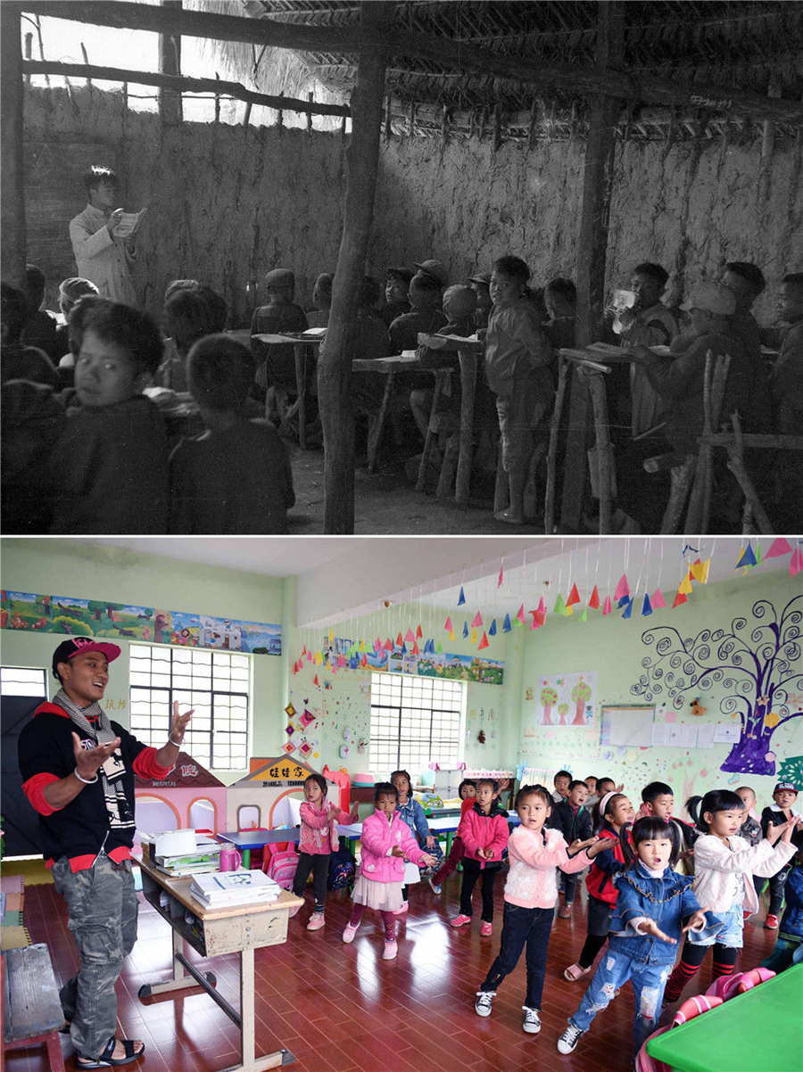 拼版照片:上圖為1954年,在云南省普洱市西盟佤族自治縣創(chuàng)辦的第一所小學(xué)——西盟小學(xué),老師帶領(lǐng)孩子讀書(shū)學(xué)習(xí)(資料照片);下圖為2018年12月7日,云南省普洱市西盟佤族自治縣勐梭鎮(zhèn)班母村佤山育忠幼兒園的孩子跟著老師巖科上音樂(lè)課。1986年出生的巖科是班母村佤族寨人。他說(shuō),我的阿媽小時(shí)候沒(méi)有進(jìn)過(guò)一天學(xué)堂,現(xiàn)在,佤山的孩子們都在寬敞明亮的教室里學(xué)習(xí)(新華社記者楊宗友攝)。新華社發(fā)