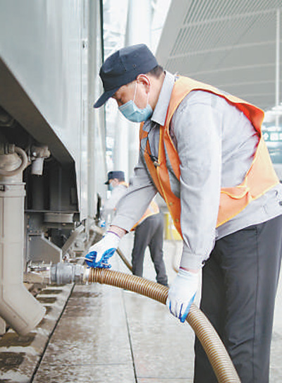 吸污組沿著狹長的車廂線作業(yè),隊員的耳麥里,不時響起離站時間的提醒。以車廂為界,一側(cè)是匆忙下車的旅客,一側(cè)是緊張作業(yè)的小分隊。