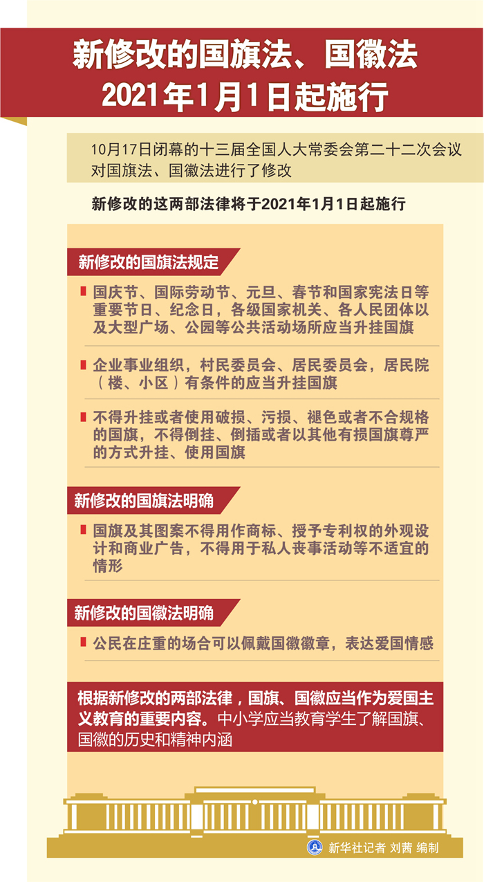 新華社北京10月17日電(記者丁小溪)17日閉幕的十三屆全國人大常委會(huì)第二十二次會(huì)議對(duì)國旗法、國徽法進(jìn)行了修改。新修改的這兩部法律將于2021年1月1日起施行。