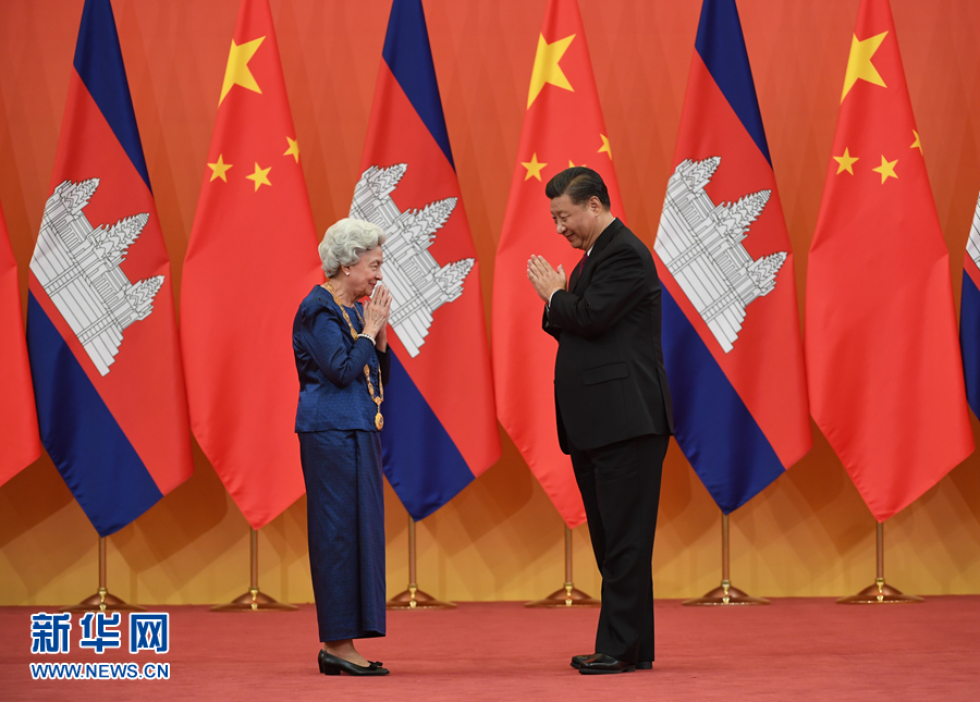 11月6日,國(guó)家主席習(xí)近平在北京人民大會(huì)堂為柬埔寨太后莫尼列舉行中華人民共和國(guó)“友誼勛章”頒授儀式。 新華社記者 張領(lǐng) 攝