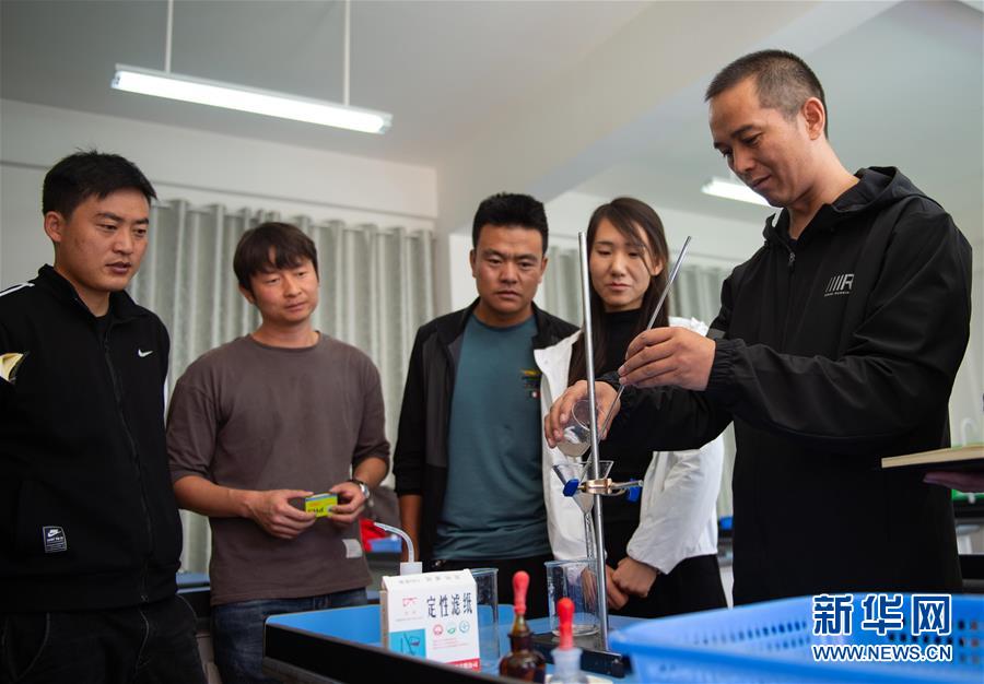北京市援青支教教師、來(lái)自通州區(qū)陸辛莊學(xué)校的化學(xué)教師祁生貴(右一)在青海省玉樹(shù)州第四民族高級(jí)中學(xué)指導(dǎo)學(xué)校教師進(jìn)行實(shí)驗(yàn)教學(xué)(8月12日攝)。新華社記者 陳鐘昊 攝