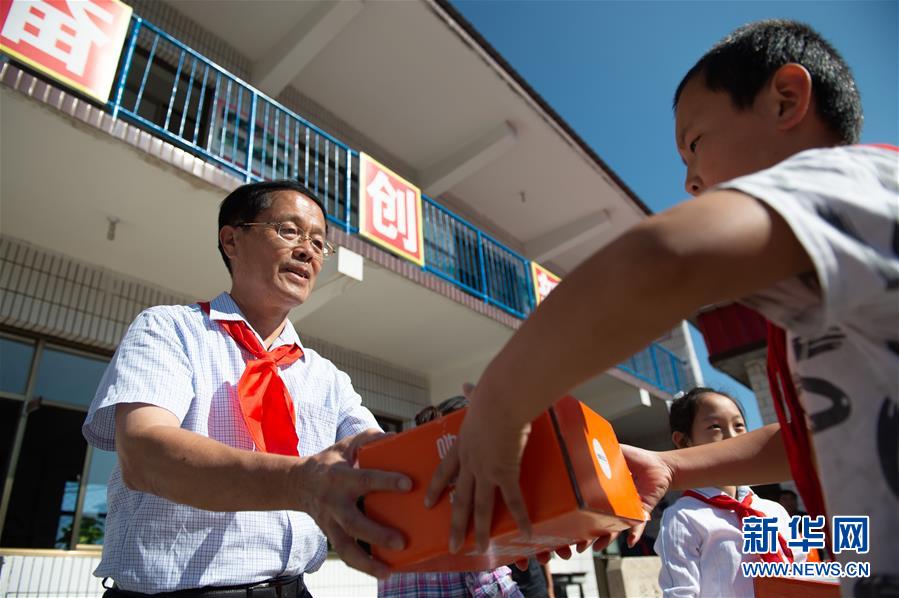 北京市西城區(qū)陶然亭小學(xué)退休老校長(zhǎng)劉建文(左)在他支教的河北省阜平縣半溝小學(xué)開(kāi)學(xué)典禮上給學(xué)生贈(zèng)送學(xué)習(xí)用品(9月3日攝)。新華社記者 陳鐘昊 攝