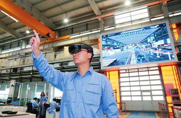 工作人員在中國商飛公司總裝制造中心智慧數(shù)控車間使用 AR 眼鏡操控虛擬電子屏幕(2018年5月5日攝)丁汀攝