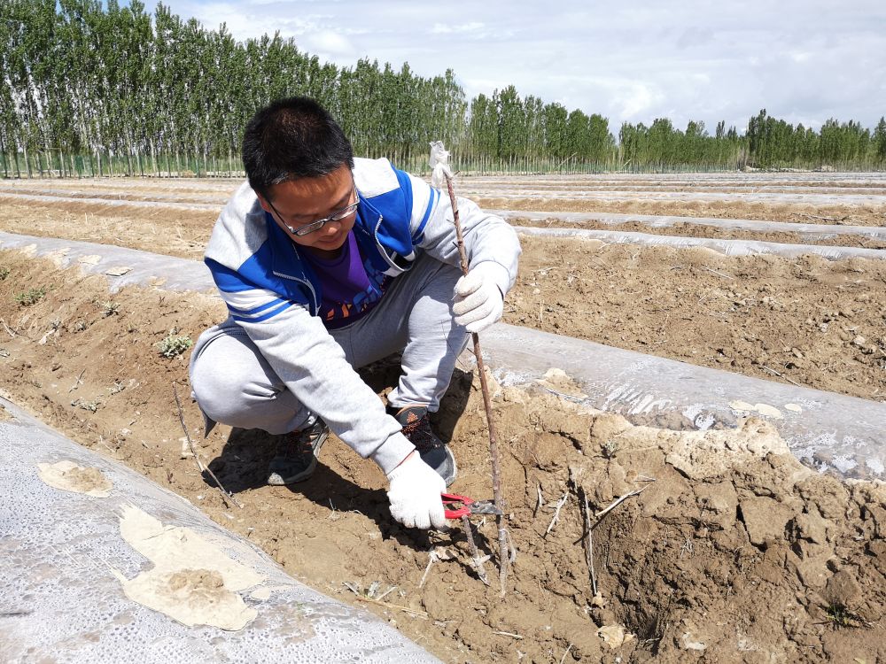 2019年春季,呼延瑋在蘭干村扶貧果園修剪嫁接后的樹苗。(采訪對(duì)象供圖)