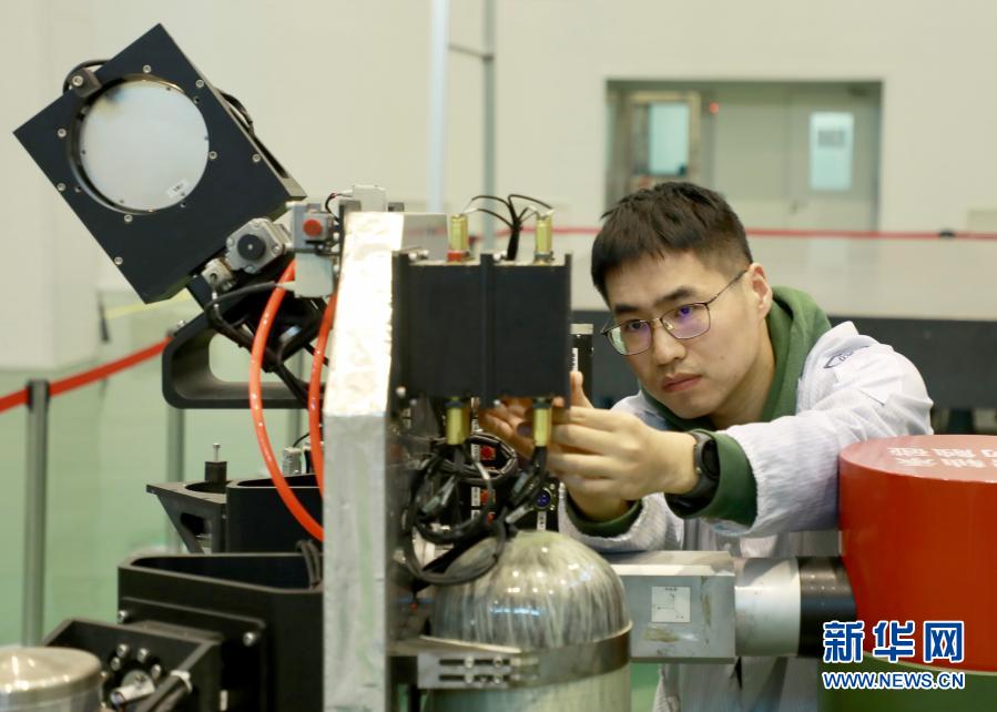 哈爾濱工業(yè)大學(xué)航天學(xué)院博士研究生吳凡調(diào)試微納衛(wèi)星實驗設(shè)備(11月9日攝)。新華社記者 何山 攝