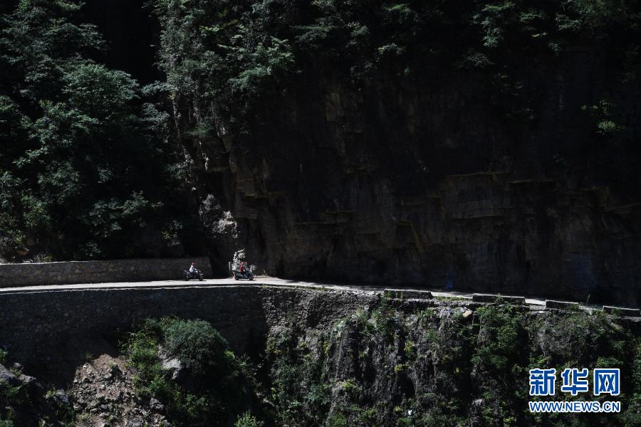 兩名下莊村村民騎著摩托車(chē)行駛在下莊村通往外界的公路上(2017年6月7日攝)。