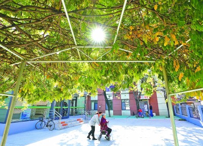 河北唐山市路北區(qū)煤研分院社區(qū)幸福家園養(yǎng)老服務中心,工作人員陪護一位老人在院內(nèi)活動。新華社發(fā)