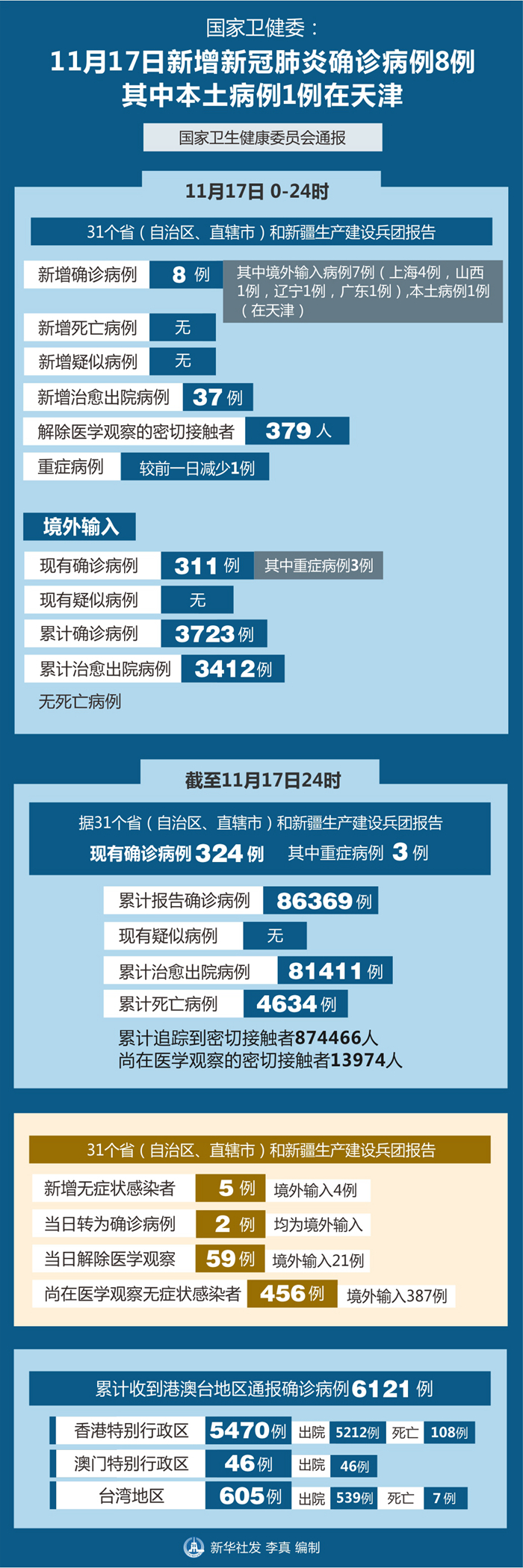 截至11月17日24時(shí),據(jù)31個(gè)省(自治區(qū)、直轄市)和新疆生產(chǎn)建設(shè)兵團(tuán)報(bào)告,現(xiàn)有確診病例324例(其中重癥病例3例),累計(jì)治愈出院病例81411例,累計(jì)死亡病例4634例,累計(jì)報(bào)告確診病例86369例,無(wú)現(xiàn)有疑似病例。累計(jì)追蹤到密切接觸者874466人,尚在醫(yī)學(xué)觀(guān)察的密切接觸者13974人。