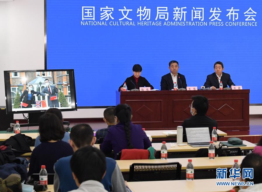 11月18日,國家文物局文物返還辦公室主任鄧超(右一)向媒體介紹文物返還交接情況。新華社記者 李賀 攝