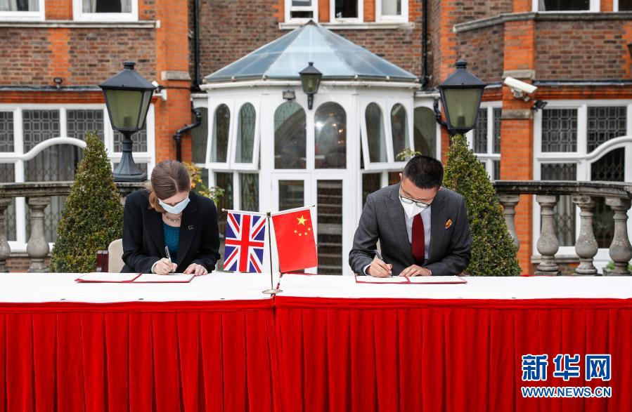 10月16日,在英國倫敦,代表中國國家文物局的中國駐英國大使館文化處一秘于果(右)和代表英國大都會警察局的探員蘇菲·海斯簽署文物接收確認(rèn)書。新華社記者 韓巖 攝