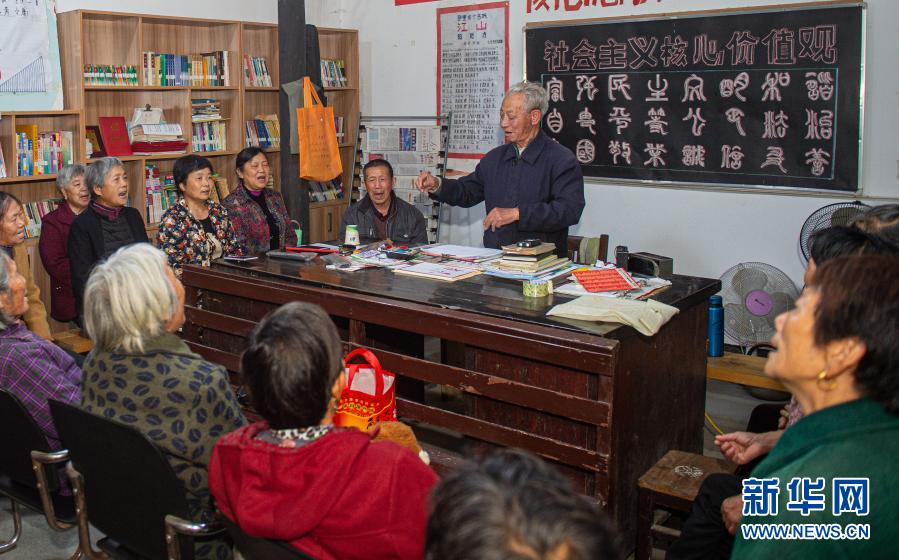 11月17日晚,大陳村村民聚在村圖書室一同唱歌。大陳村每周在圖書室組織三次歌唱活動,歌曲以自編的村歌為主。新華社發(fā)(江漢 攝)