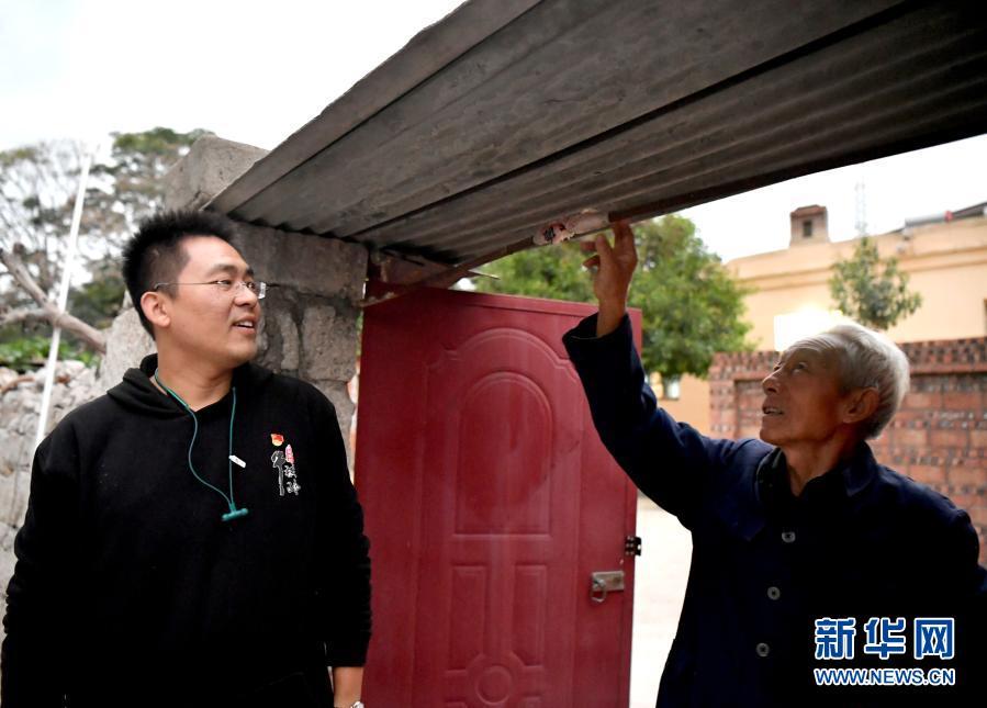 牛橫嶺村村民牛天保(右)將自家門梁掰成拱形并用布條包住,以防田昕進門時碰到頭(10月12日攝)。新華社記者 李嘉南 攝