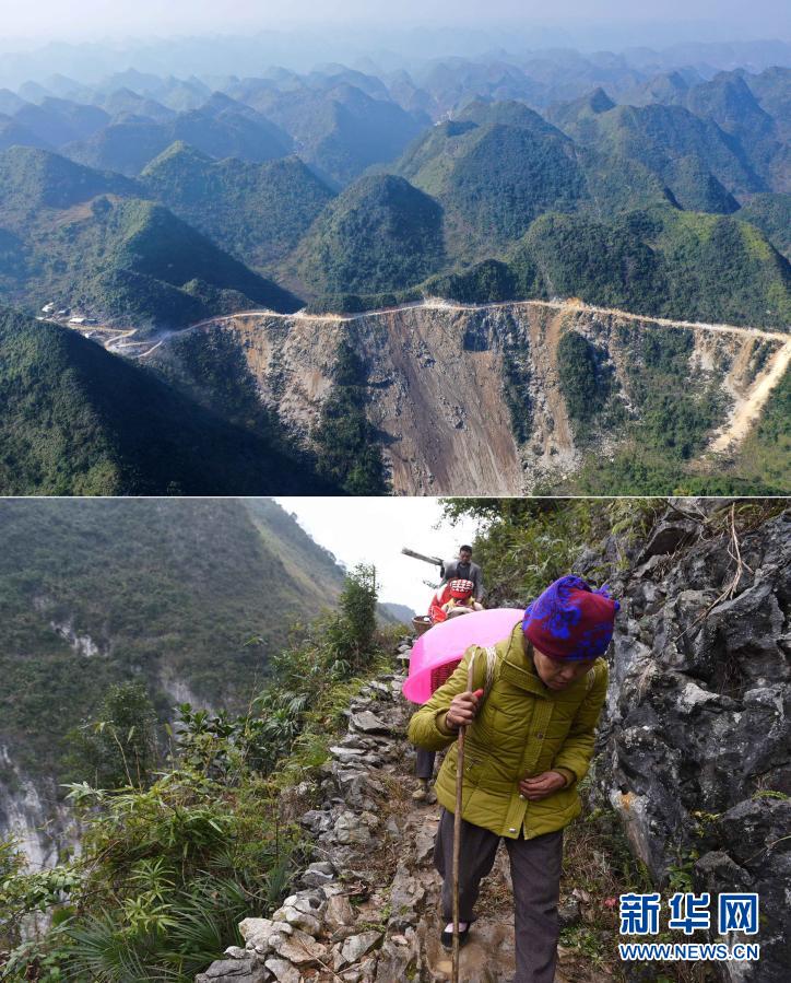 這是一張拼版照片。上圖:已經修通水泥路的大化瑤族自治縣板升鄉(xiāng)八好村(2019年11月11日攝,無人機照片);下圖:在尚未通路前,八好村村民背著年貨走山路回家(2016年1月26日攝)。新華社記者 黃孝邦 攝