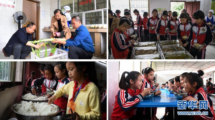 這是一張拼版照片。上左:在融水苗族自治縣東陽村小學,廚房師傅們在準備營養(yǎng)午餐;上右:東陽村小學學生根據需要挑選菜肴。下左:東陽村小學學生排隊打飯;下右:東陽村小學學生在食用營養(yǎng)午餐。近年來,廣西在貧困地區(qū)大力推行學生營養(yǎng)餐,幫助貧困學生健康成長(2019年5月6日攝)。新華社記者 張愛林 攝