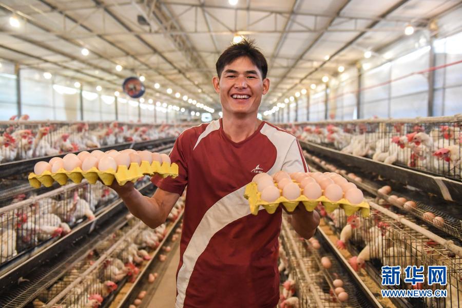 廣西武宣縣金雞鄉(xiāng)仁元村的返鄉(xiāng)創(chuàng)業(yè)者覃永靈在養(yǎng)殖場內展示他收獲的雞蛋(6月18日攝)。新華社記者 曹祎銘 攝