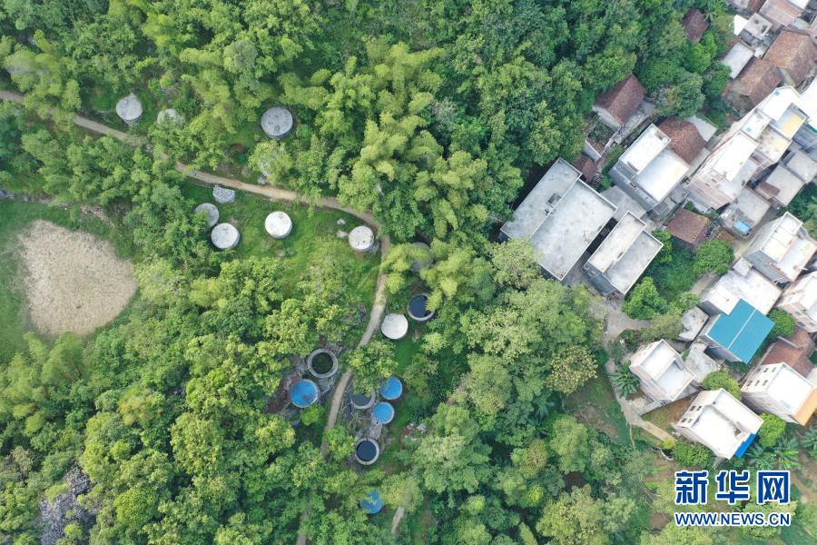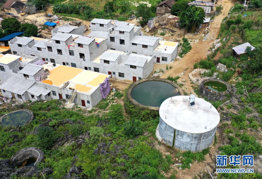 這是7月23日在廣西都安瑤族自治縣三只羊鄉(xiāng)雞峒村拍攝的水柜(無(wú)人機(jī)照片)。利用山石修建的第1代水柜、用水泥砂石修建的第2水柜以及第3代加蓋并配備抽水設(shè)備的水柜,見證了大石山區(qū)村民飲水的變遷。新華社記者 周華 攝