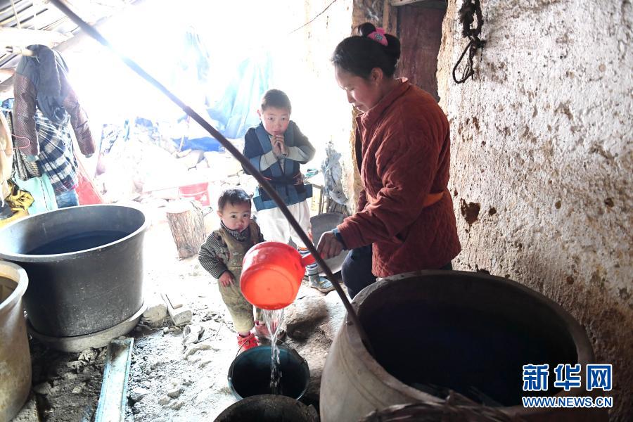 在廣西南丹縣里湖瑤族鄉(xiāng),一個(gè)村民從水缸里舀水(2018年2月5日攝)。新華社記者 周華 攝