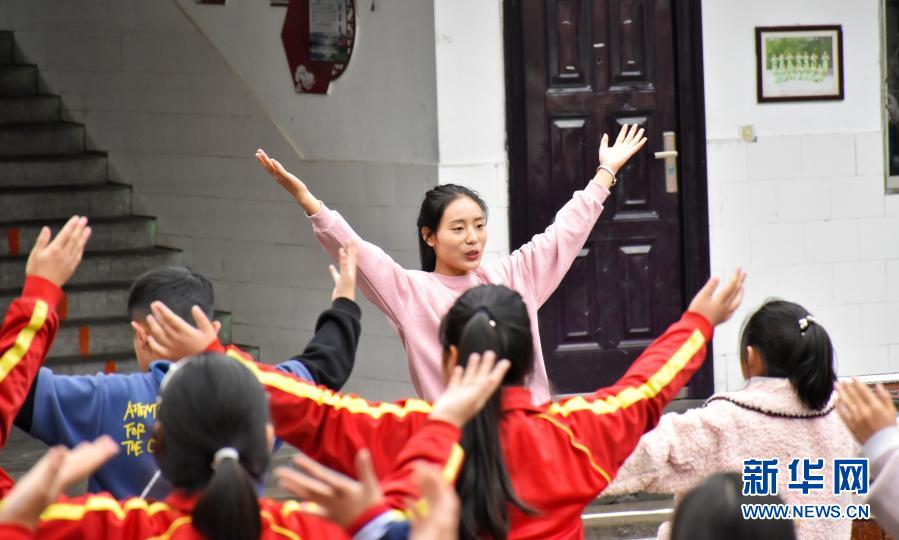 11月18日,在河南省洛陽市嵩縣德亭鎮(zhèn)酒店小學,王予川帶學生做韻律操。新華社記者 韓朝陽 攝