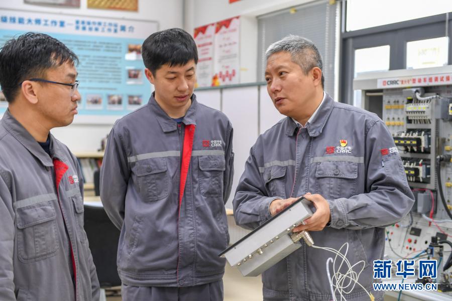 11月25日,在中車長春軌道客車股份有限公司高速動車組制造中心調(diào)試車間,羅昭強(qiáng)(右一)與同事研究高鐵列車網(wǎng)絡(luò)實(shí)驗(yàn)裝置。新華社記者 張楠 攝