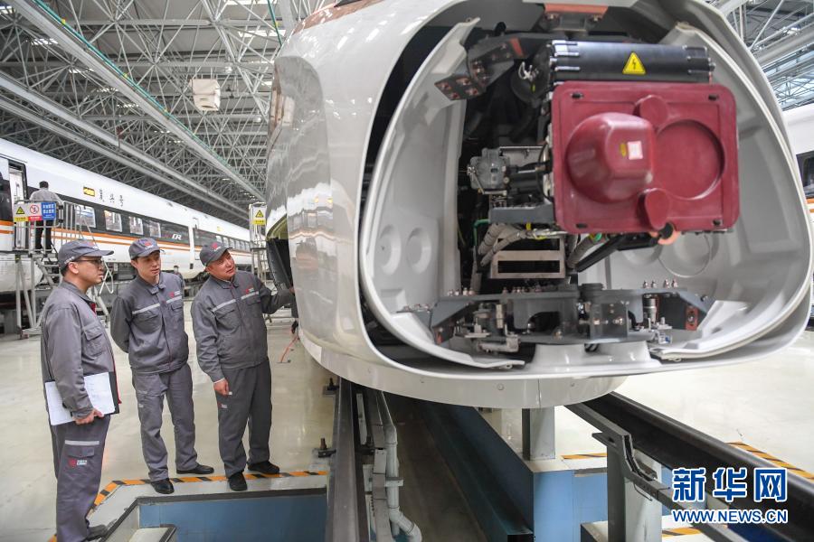 11月25日,在中車長春軌道客車股份有限公司高速動車組制造中心調(diào)試車間,羅昭強(qiáng)(右一)與同事檢查復(fù)興號高鐵列車的電氣系統(tǒng)。新華社記者 張楠 攝