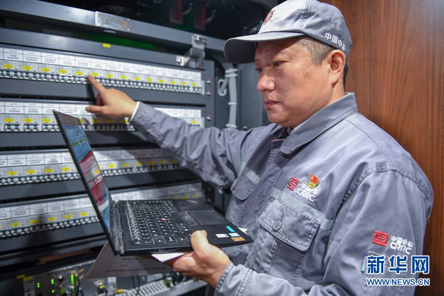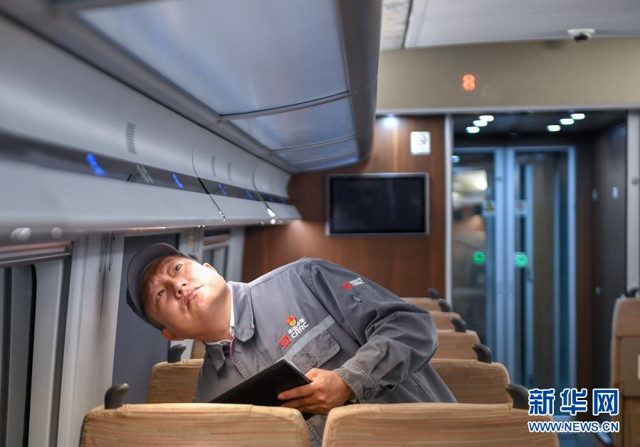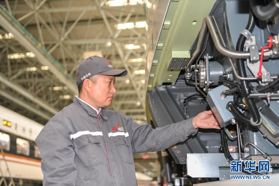 11月25日,在中車長春軌道客車股份有限公司高速動車組制造中心調(diào)試車間,羅昭強(qiáng)檢查復(fù)興號高鐵列車裝置的工作情況。新華社記者 張楠 攝